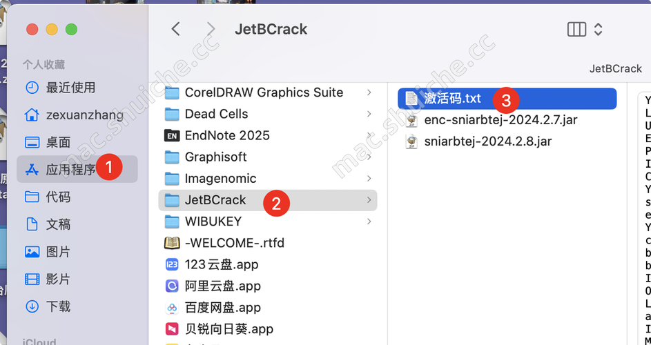 应用程序 -> JetBCrack目录下,会有一个激活码.txt