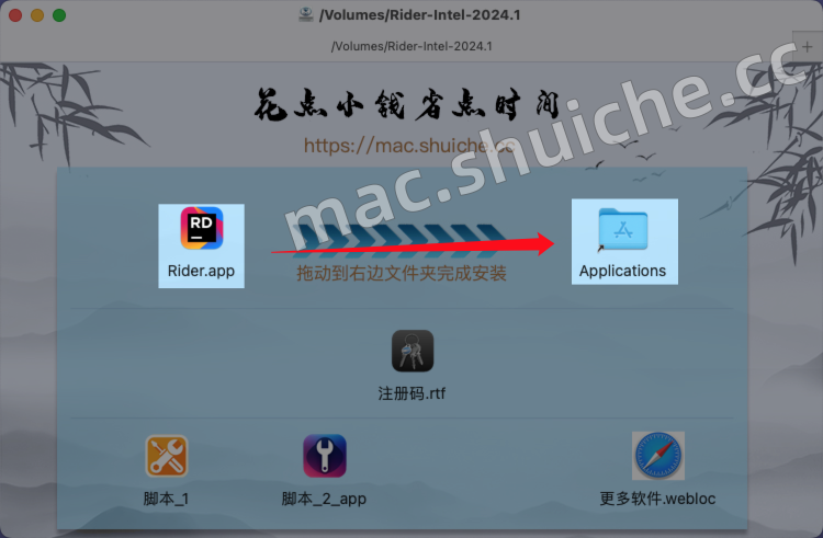 1. 打开下载好的软件包,拖动软件 Rider 到右边的文件夹中进行安装