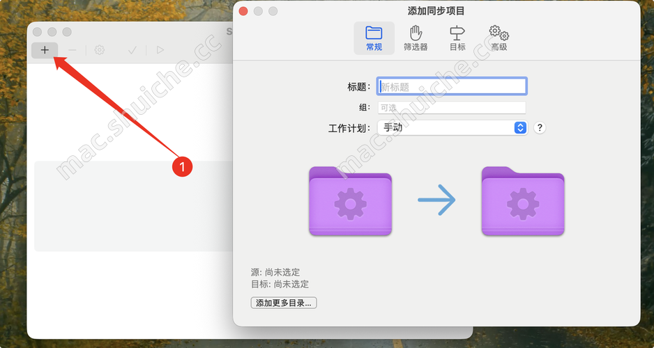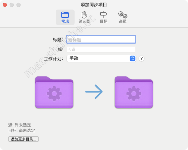 您可以根据需要创建任意数量的同步项,并分别自定义每个同步项。同步项目主要由两个文件夹组成:源文件夹和目标文件夹。您可以选择Finder中可访问的任意两个文件夹:它们可以位于Mac上,外部驱动器(如USB随身碟)上,甚至可以位于远程服务器上。在可能的选项中,您会发现: