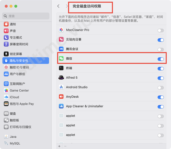 2.打开微信,提示微信想访问其他App数据,点允许一直弹? 解决办法:系统设置--隐私与安全性--完全磁盘访问权限--把微信的权限打开就好了